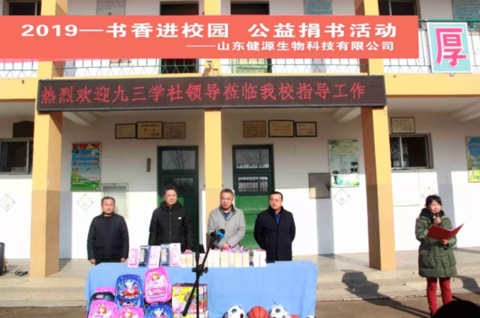 一本書傳遞一份愛,一份愛成就一個夢想,一個夢想讓無限希望起航,愛心就像一個蒲公英,和著暖陽來到了校園。元旦將至,歲寒情深,2019年12月27日,九三學(xué)社與山東健源生物科技有限公司共同為泰安市高新區(qū)化馬灣小學(xué)捐贈了一批書籍、學(xué)習(xí)用品和體育器材,為學(xué)生和老師們送去社會的關(guān)心、關(guān)懷和關(guān)愛。