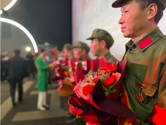 鮮花贈英雄,初心永不忘,觀影代表向現(xiàn)場抗美援朝老兵們送上綬帶和鮮花,衷心祝愿老戰(zhàn)士身體健康,萬事如意。