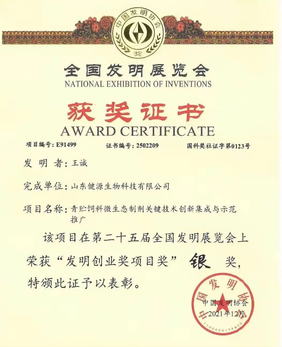 會議期間舉行全國發(fā)明展覽會“發(fā)明創(chuàng)業(yè)獎(jiǎng)項(xiàng)目獎(jiǎng)”頒獎(jiǎng)典禮,山東健源生物科技有限公司申報(bào)的“青貯飼料微生態(tài)制劑關(guān)鍵技術(shù)創(chuàng)新集成與示范推廣”項(xiàng)目,受到專家評委的肯定,在眾多發(fā)明中脫穎而出,榮獲“發(fā)明創(chuàng)業(yè)獎(jiǎng)項(xiàng)目獎(jiǎng)”銀獎(jiǎng)。