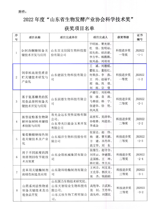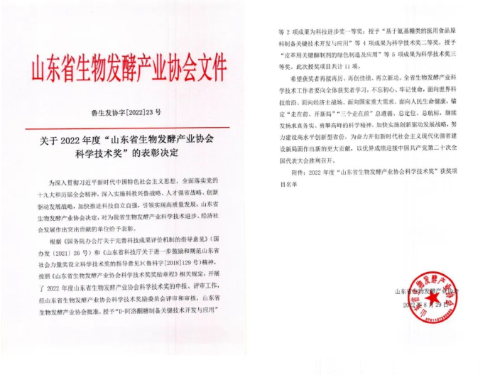 按照《山東省生物發(fā)酵產(chǎn)業(yè)協(xié)會(huì)科學(xué)技術(shù)獎(jiǎng)獎(jiǎng)勵(lì)章程》相關(guān)規(guī)定,開展2022年度山東省生物發(fā)酵產(chǎn)業(yè)協(xié)會(huì)科學(xué)技術(shù)獎(jiǎng)的申報(bào)、評審工作,經(jīng)山東省生物發(fā)酵產(chǎn)業(yè)協(xié)會(huì)科學(xué)技術(shù)獎(jiǎng)勵(lì)委員會(huì)評審和審核,山東省生物發(fā)酵產(chǎn)業(yè)協(xié)會(huì)批準(zhǔn),授予山東健源生物科技有限公司成果為科技進(jìn)步獎(jiǎng)一等獎(jiǎng)。