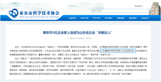山東健源生物董事長王誠榮獲2022山東省企業(yè)“創(chuàng)新達(dá)人”稱號