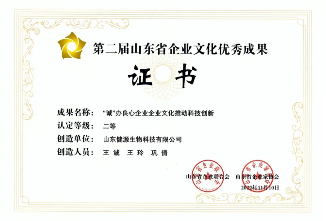 山東省企業(yè)聯(lián)合會(huì)、山東省企業(yè)家協(xié)會(huì)聯(lián)合開(kāi)展了第二屆山東省企業(yè)文化優(yōu)秀成果發(fā)布活動(dòng)。通過(guò)企業(yè)申報(bào),各市企業(yè)聯(lián)合會(huì)、企業(yè)家協(xié)會(huì)和有關(guān)部門(單位)推薦,依據(jù)《山東省企業(yè)文化成果認(rèn)定規(guī)范》團(tuán)體標(biāo)準(zhǔn),按照公開(kāi)、公正的原則,堅(jiān)持嚴(yán)謹(jǐn)、科學(xué)、規(guī)范的程序,經(jīng)初審、發(fā)布會(huì)現(xiàn)場(chǎng)發(fā)布、專家評(píng)審,有79項(xiàng)成果被確定為山東省企業(yè)文化優(yōu)秀成果,山東健源生物科技有限公司《“誠(chéng)”辦良心企業(yè),企業(yè)文化推動(dòng)科技創(chuàng)新》企業(yè)文化成果榮獲第二屆山東省企業(yè)文化優(yōu)秀成果二等獎(jiǎng)。