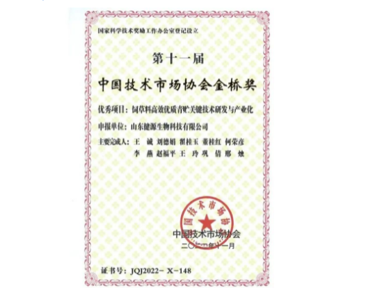 近日, “構(gòu)建新發(fā)展格局,建設(shè)中國(guó)式現(xiàn)代化高層報(bào)告會(huì)暨第十一屆中國(guó)技術(shù)市場(chǎng)協(xié)會(huì)金橋獎(jiǎng)表彰獎(jiǎng)勵(lì)大會(huì)”在北京隆重召開,經(jīng)專家評(píng)審委員會(huì)評(píng)審,山東健源生物科技有限公司《飼草料高效優(yōu)質(zhì)青貯關(guān)鍵技術(shù)研發(fā)與產(chǎn)業(yè)化》項(xiàng)目榮獲第十一屆中國(guó)技術(shù)市場(chǎng)協(xié)會(huì)金橋獎(jiǎng)優(yōu)秀項(xiàng)目獎(jiǎng)。
