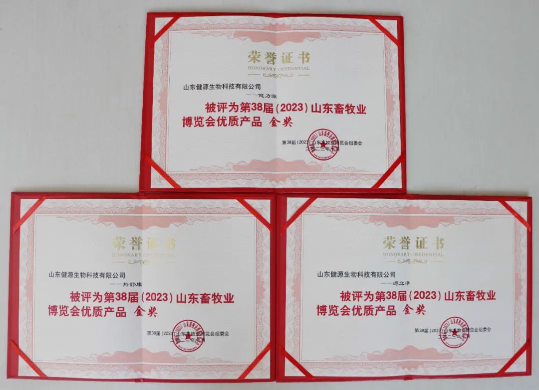 會上對獲獎單位進行頒獎,健源生物產(chǎn)品“健力源”、“源立凈”、“熱舒康”,均被評為第38屆(2023)山東畜牧業(yè)博覽會優(yōu)質(zhì)產(chǎn)品金獎。