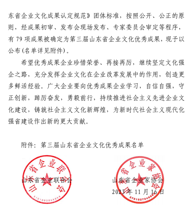 本次企業(yè)文化成果評(píng)選活動(dòng)由山東省企業(yè)聯(lián)合會(huì)、山東省企業(yè)家協(xié)會(huì)主辦,為深入貫徹落實(shí)習(xí)近平新時(shí)代中國(guó)特色社會(huì)主義思想和黨的二十大精神,認(rèn)真學(xué)習(xí)貫徹習(xí)近平文化思想,堅(jiān)持中國(guó)特色社會(huì)主義文化發(fā)展道路,增強(qiáng)文化自信,積極踐行社會(huì)主義核心價(jià)值觀,不斷挖掘和培育我省企業(yè)文化建設(shè)典型,做好全國(guó)企業(yè)文化優(yōu)秀成果發(fā)布活動(dòng)的遴選推薦工作。通過推出一批把握文化方向、時(shí)代脈搏的企業(yè)文化優(yōu)秀成果,堅(jiān)定廣大企業(yè)以文化強(qiáng)企之路,充分發(fā)揮企業(yè)文化在企業(yè)發(fā)展中的作用。