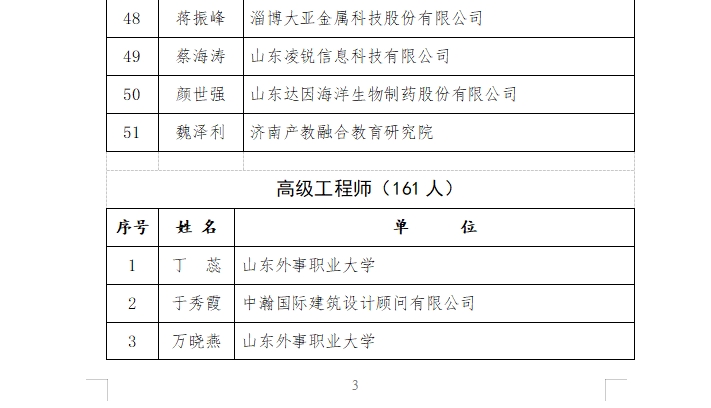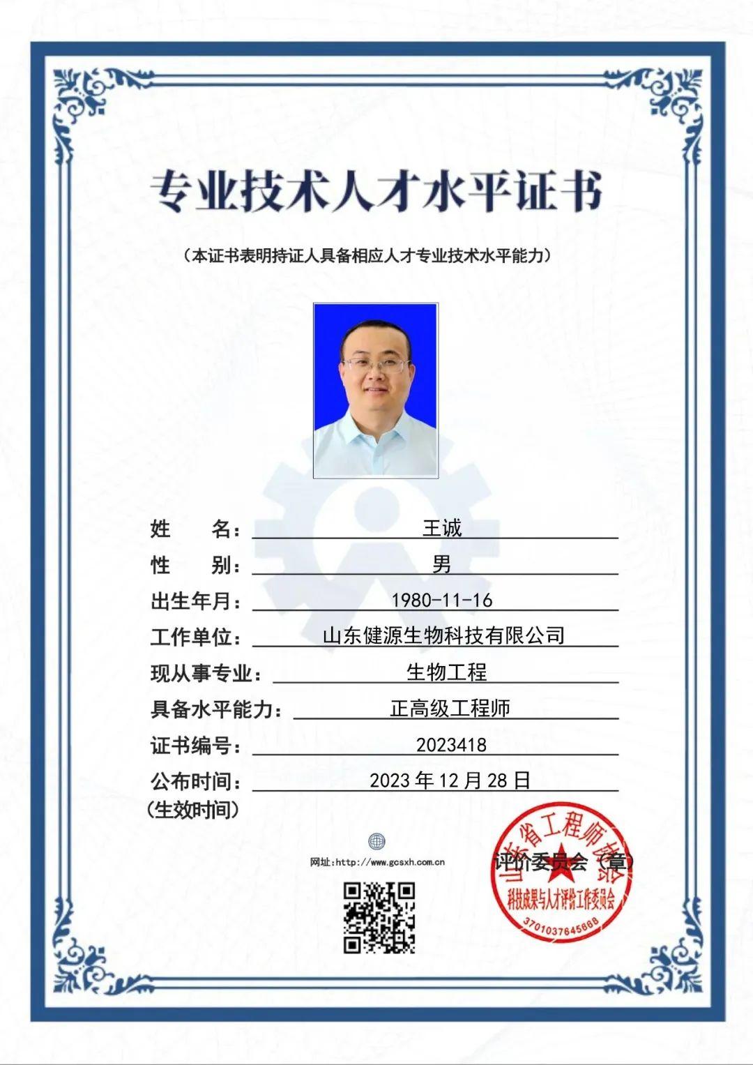 根據(jù)《山東省工程師協(xié)會(huì)人才評(píng)價(jià)實(shí)施意見(jiàn)(試行)》和《山東省工程師協(xié)會(huì)人才評(píng)價(jià)試行標(biāo)準(zhǔn)》,經(jīng)資格審查和專家評(píng)審?fù)ㄟ^(guò),共有51人具備正高級(jí)工程師資格、161人具備高級(jí)工程師資格,154人具備工程師資格,53人具備助理工程師資格。山東健源生物科技有限公司董事長(zhǎng)王誠(chéng)獲評(píng)正高級(jí)工程師資格。