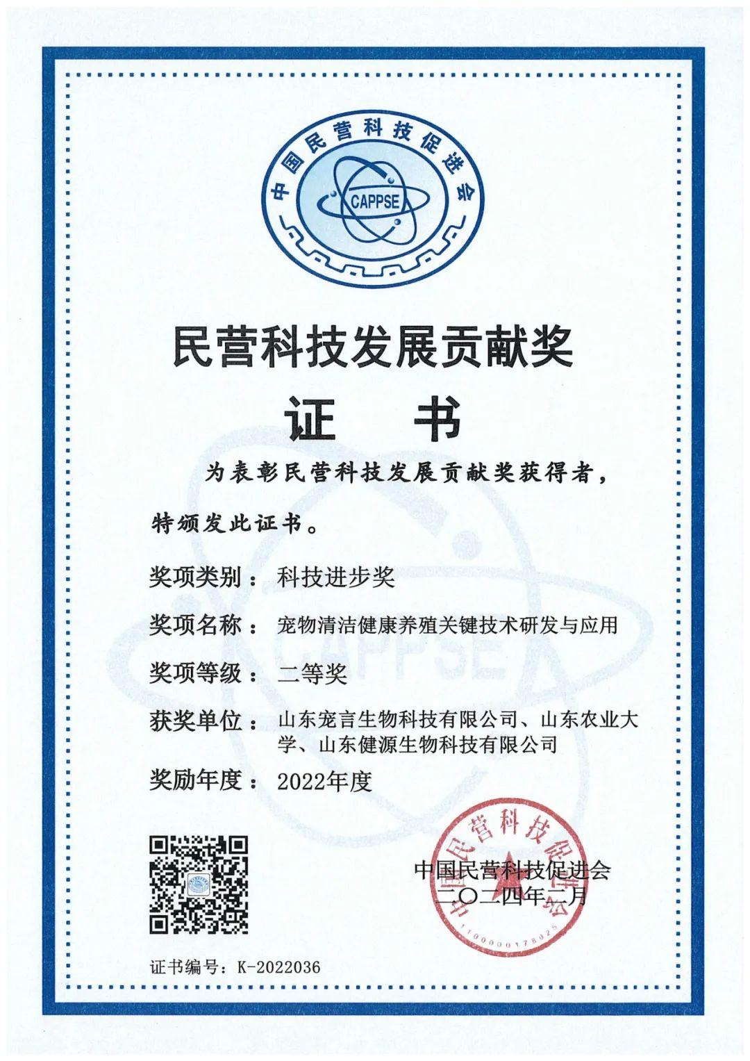 山東健源生物科技有限公司及旗下山東寵言生物科技有限公司聯(lián)合山東農(nóng)業(yè)大學(xué)共同完成的“寵物清潔健康養(yǎng)殖關(guān)鍵技術(shù)研發(fā)與應(yīng)用”項(xiàng)目榮獲“2022年度民營科技發(fā)展貢獻(xiàn)獎科技進(jìn)步獎二等獎”。