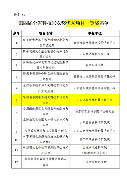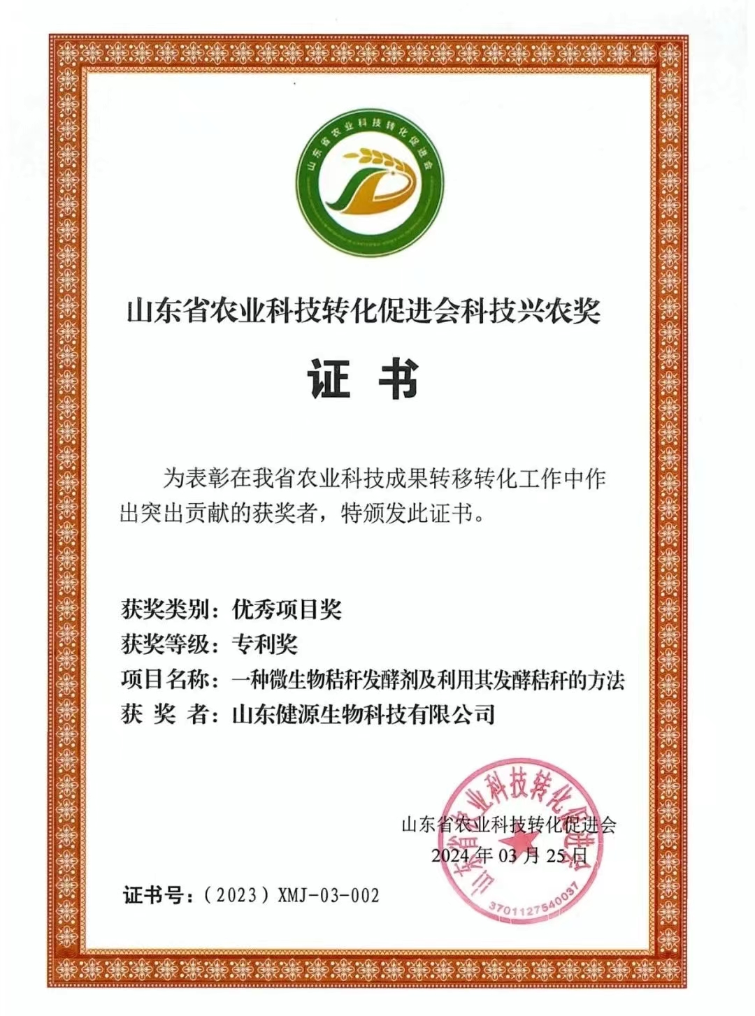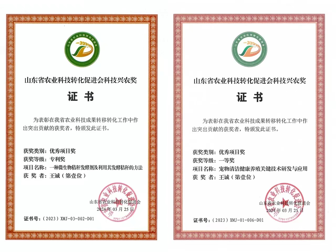 山東健源生物科技有限公司申報的《一種微生物秸稈發(fā)酵劑及其發(fā)酵秸稈的方法》項目獲得山東省農業(yè)科技轉化促進會科技興農獎優(yōu)秀項目獎專利獎。健源生物旗下子公司山東寵言生物科技有限公司申報的《寵物清潔健康養(yǎng)殖關鍵技術研發(fā)與應用》項目獲得山東省農業(yè)科技促進會科技興農獎優(yōu)秀項目獎一等獎,董事長王誠為兩個項目的第一完成人。