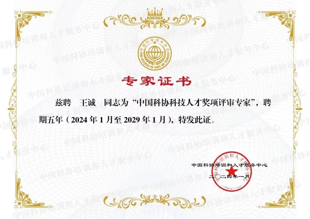 2024年1月被聘請為“中國科協(xié)科技人才獎項評審專家”