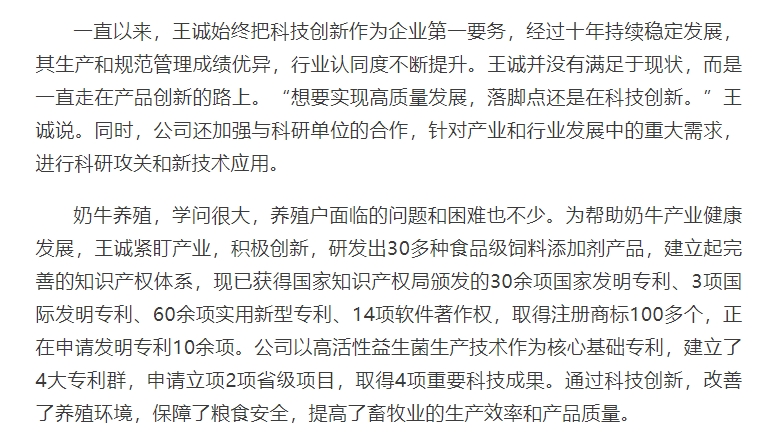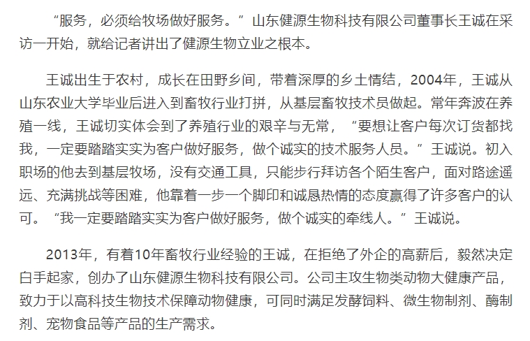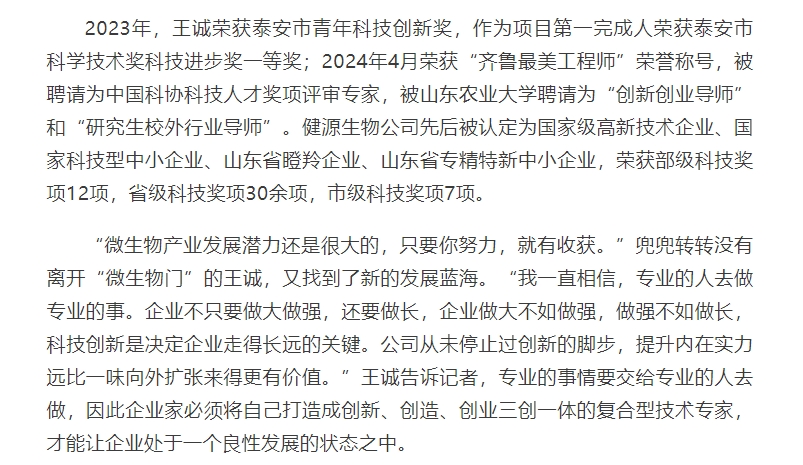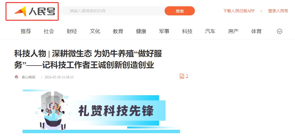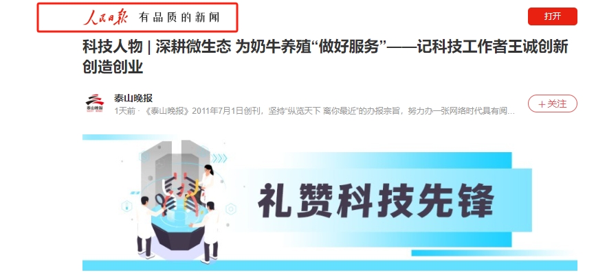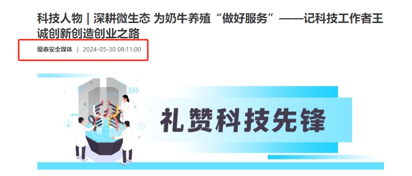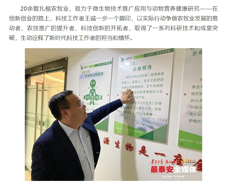 2024年5月30日迎來(lái)了第八個(gè)全國(guó)科技工作者日,山東健源生物科技有限公司董事長(zhǎng)王誠(chéng)作為泰安市科協(xié)推選的科技工作者代表接受了泰安日?qǐng)?bào)記者的采訪。《深耕微生態(tài),為奶牛養(yǎng)殖“做好服務(wù)”——記科技工作者王誠(chéng)創(chuàng)新創(chuàng)造創(chuàng)業(yè)之路》報(bào)道在人民日?qǐng)?bào)、人民號(hào)、今日頭條、泰山晚報(bào)、最泰安全媒體等多家新聞平臺(tái)發(fā)布。