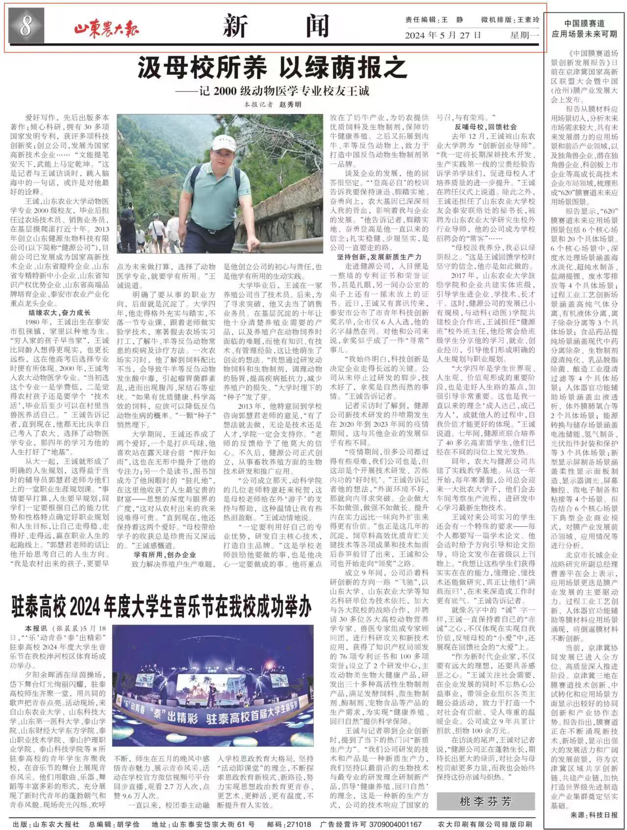 發(fā)布時間:[2024-6-1 17:23:41] 瀏覽量:2847次日前,王誠董事長作為山東農業(yè)大學校友接受《山東農大報》桃李芬芳欄目采訪。報道發(fā)表在《山東農大報》第1447期第8版,講述了王誠董事長求學創(chuàng)業(yè)之路,以實際行動反哺母校,先后被山東農業(yè)大學聘為“創(chuàng)新創(chuàng)業(yè)導師”和“研究生校外行業(yè)導師”,擔任山東畜牧獸醫(yī)學會副理事長、山東畜牧獸醫(yī)學會反芻動物科技專業(yè)委員會秘書長、副理事長。2023年被聘請為山東農業(yè)大學校友會泰安聯(lián)絡處理事會秘書長,并被授予“優(yōu)秀校友工作者”榮譽稱號,健源生物是山東農業(yè)大學“校友之家”單位、動物科技學院“教育科研實踐就業(yè)基地”。