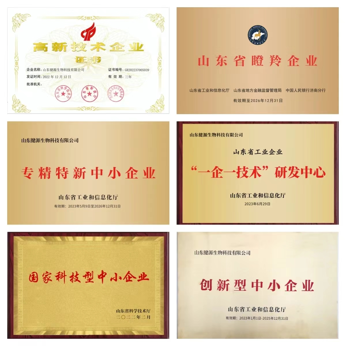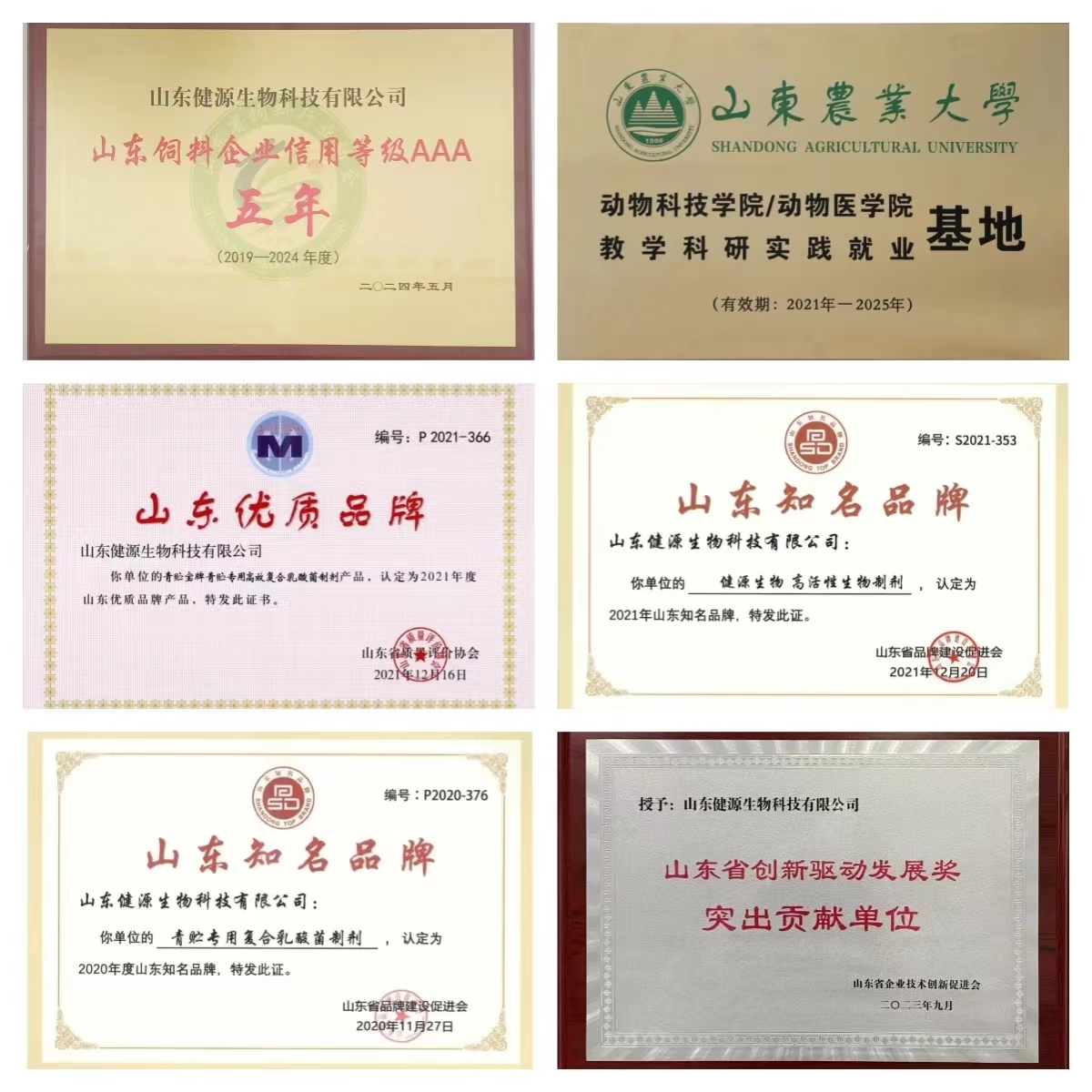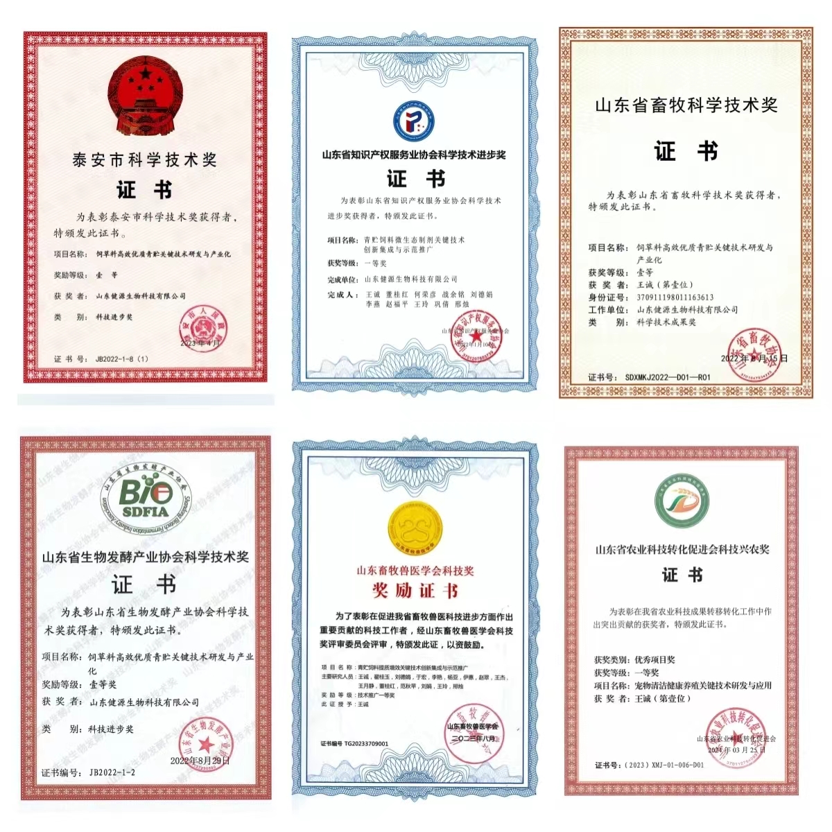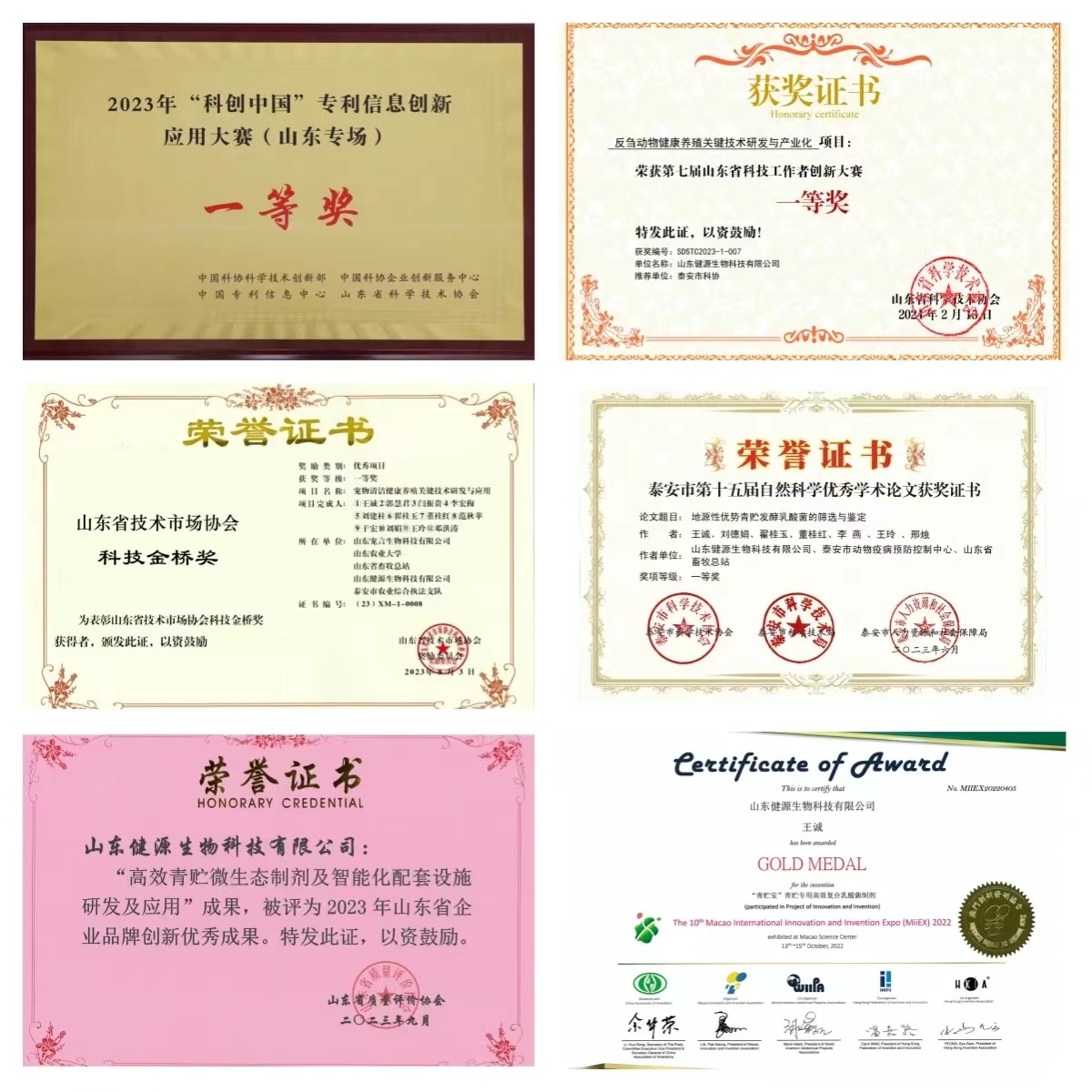 山東健源生物科技有限公司系國家高新技術(shù)企業(yè)、國家科技型中小企業(yè)、山東省瞪羚企業(yè)、山東省專精特新中小企業(yè)、山東省一企一技術(shù)研發(fā)中心、泰安市農(nóng)業(yè)產(chǎn)業(yè)化重點龍頭企業(yè)。公司深耕動物微生態(tài)行業(yè)十年,主攻動物類生物大健康產(chǎn)品,研發(fā)出三十多種高活性生物制劑產(chǎn)品,致力于以高科技生物技術(shù)保障動物健康,現(xiàn)已獲得國家知識產(chǎn)權(quán)局頒發(fā)的各類專利證書100余項,其中包括32項國家發(fā)明專利、3項國際發(fā)明專利,60余項實用新型專利、14項軟件著作權(quán),注冊商標100多個,還有正在申請中的國家發(fā)明專利20余項,累計榮獲市級科技獎項7項,省級科技獎項30余項,部級科技獎項12項。
