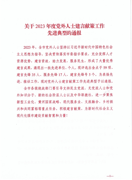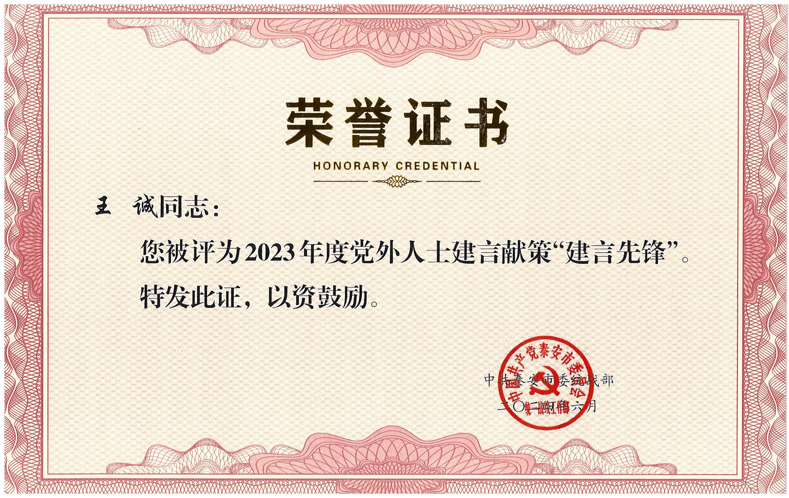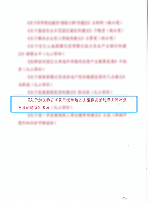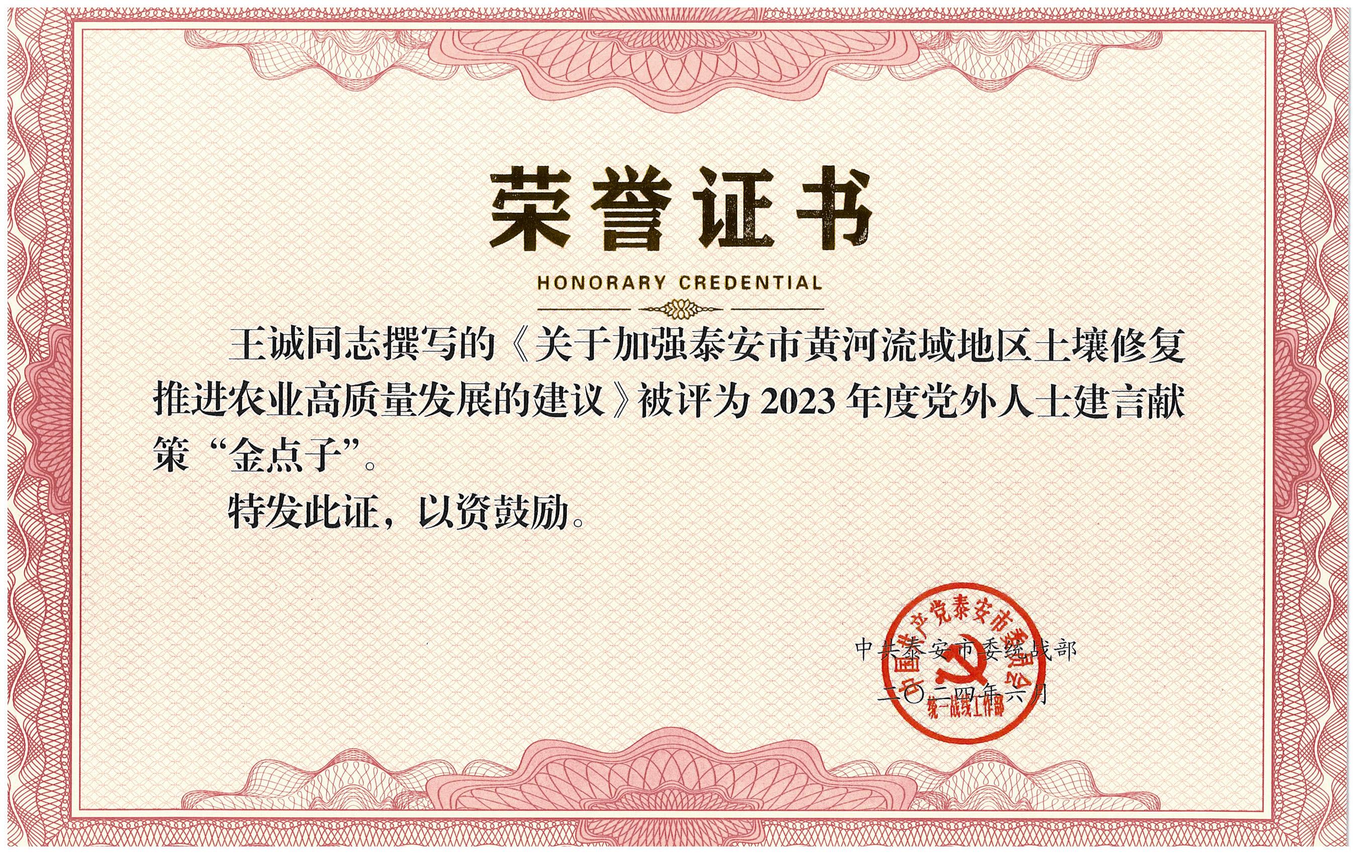 發(fā)布時間:[2024-7-9 17:52:5] 瀏覽量:3254次會上公布了《關(guān)于2023年度黨外人士建言獻策工作先進典型的通報》,王誠董事長被評為2023年度黨外人士建言獻策“建言先鋒”,撰寫的《關(guān)于加強泰安市黃河流域地區(qū)土壤修復(fù)推進農(nóng)業(yè)高質(zhì)量發(fā)展的建議》被評為2023年度黨外人士建言獻策“金點子”。