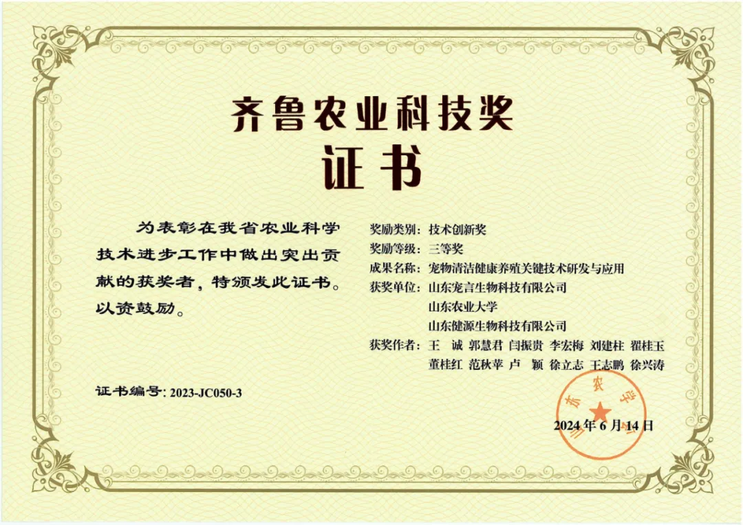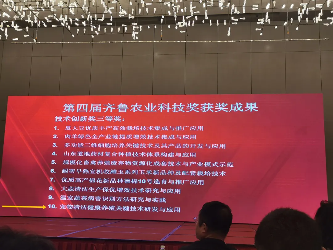 8月30日,第四屆齊魯農(nóng)業(yè)科技獎獎勵大會暨第二屆青年學術論壇在濟南召開,評選出77項2023年度齊魯農(nóng)業(yè)科技獎。山東健源生物科技有限公司與子公司山東寵言生物科技有限公司共同完成的“寵物清潔健康養(yǎng)殖關鍵技術研發(fā)與應用”項目榮獲2023年度齊魯農(nóng)業(yè)科技獎技術創(chuàng)新獎三等獎。