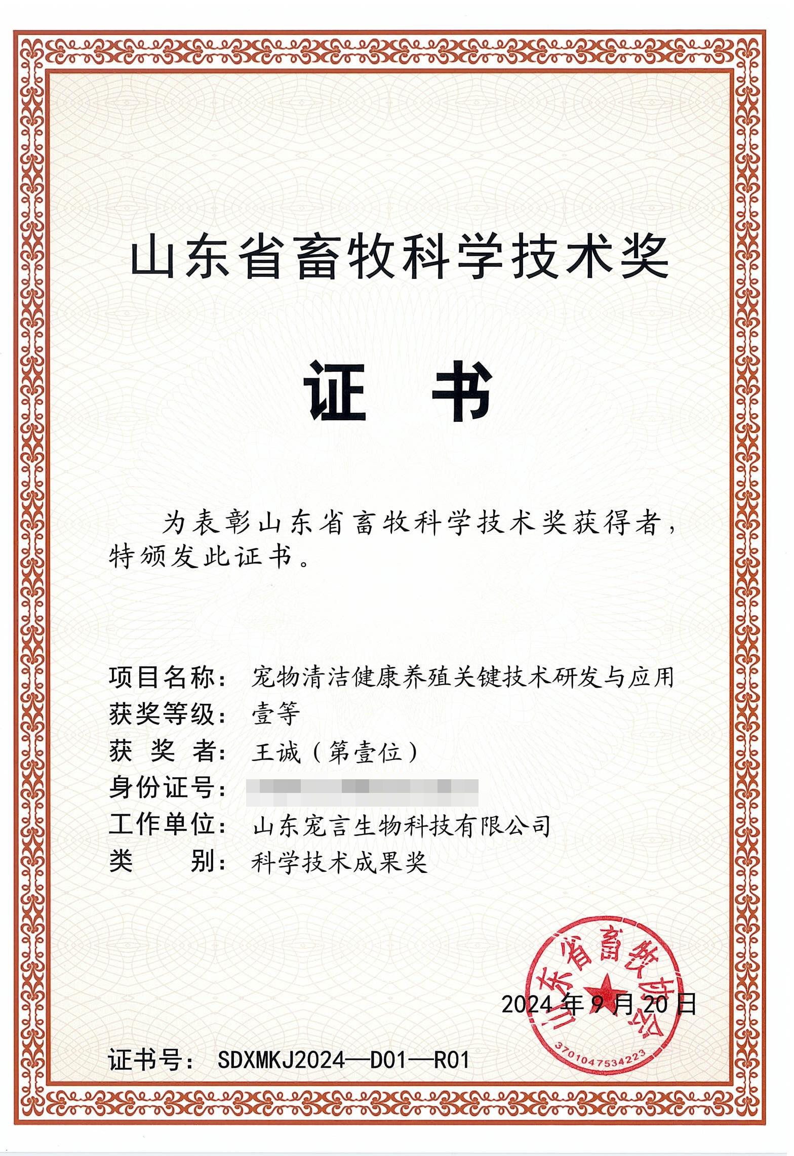 山東健源生物科技有限公司與子公司山東寵言生物科技有限公司共同完成的“寵物清潔健康養(yǎng)殖關(guān)鍵技術(shù)研發(fā)與應用”項目,憑借其創(chuàng)新性與實用性,榮獲山東省畜牧科學技術(shù)獎科學技術(shù)成果獎一等獎。