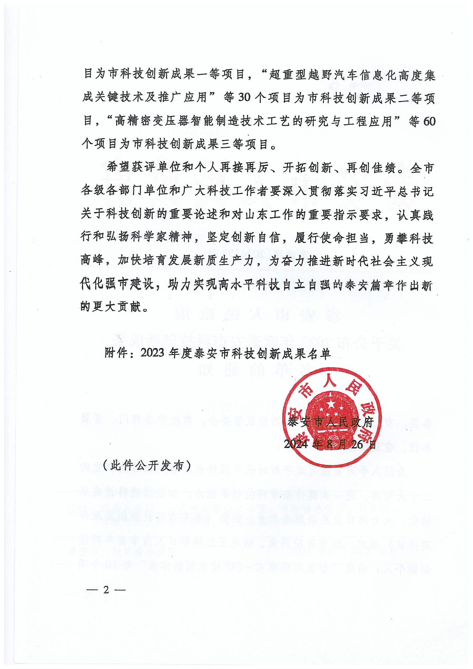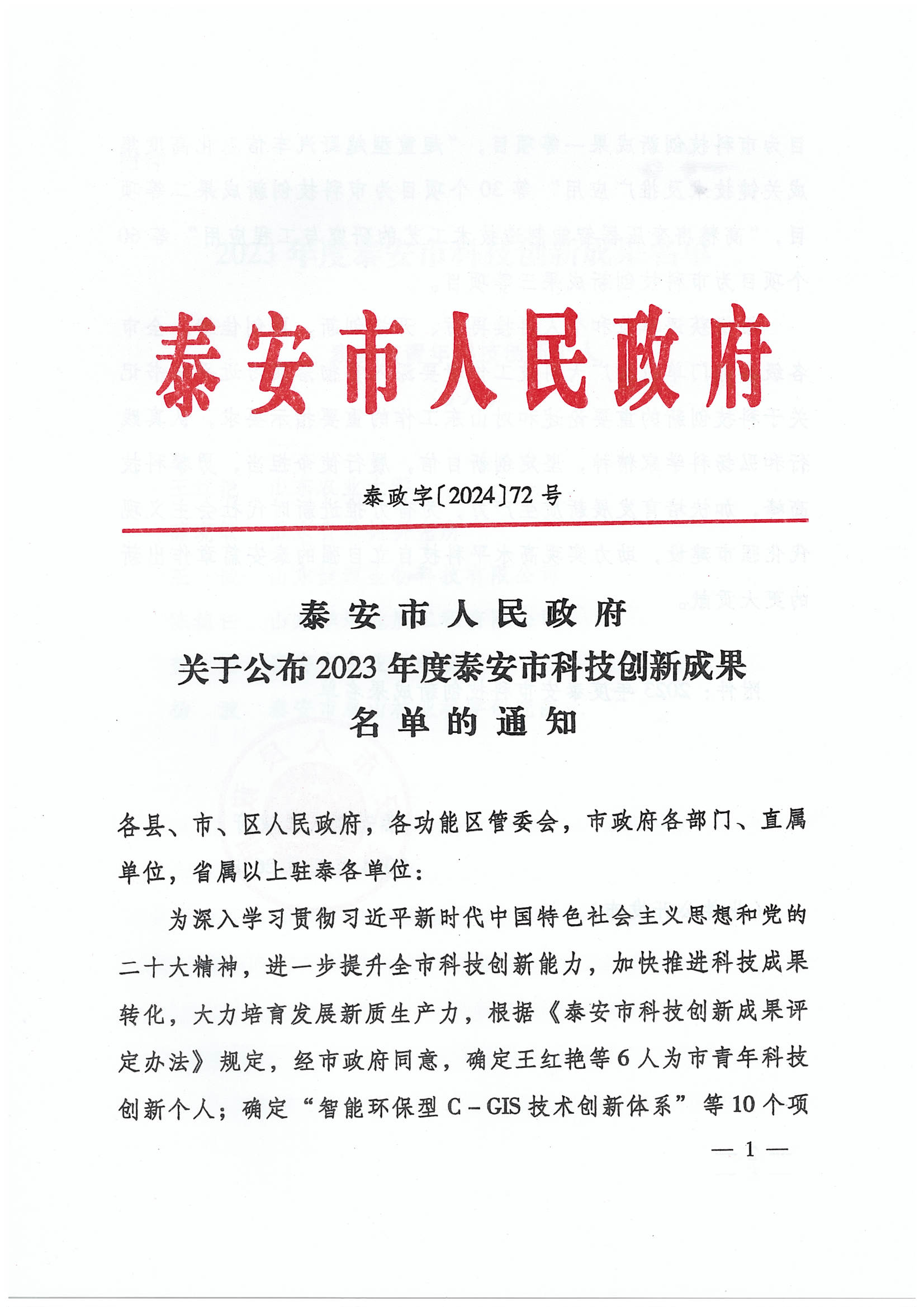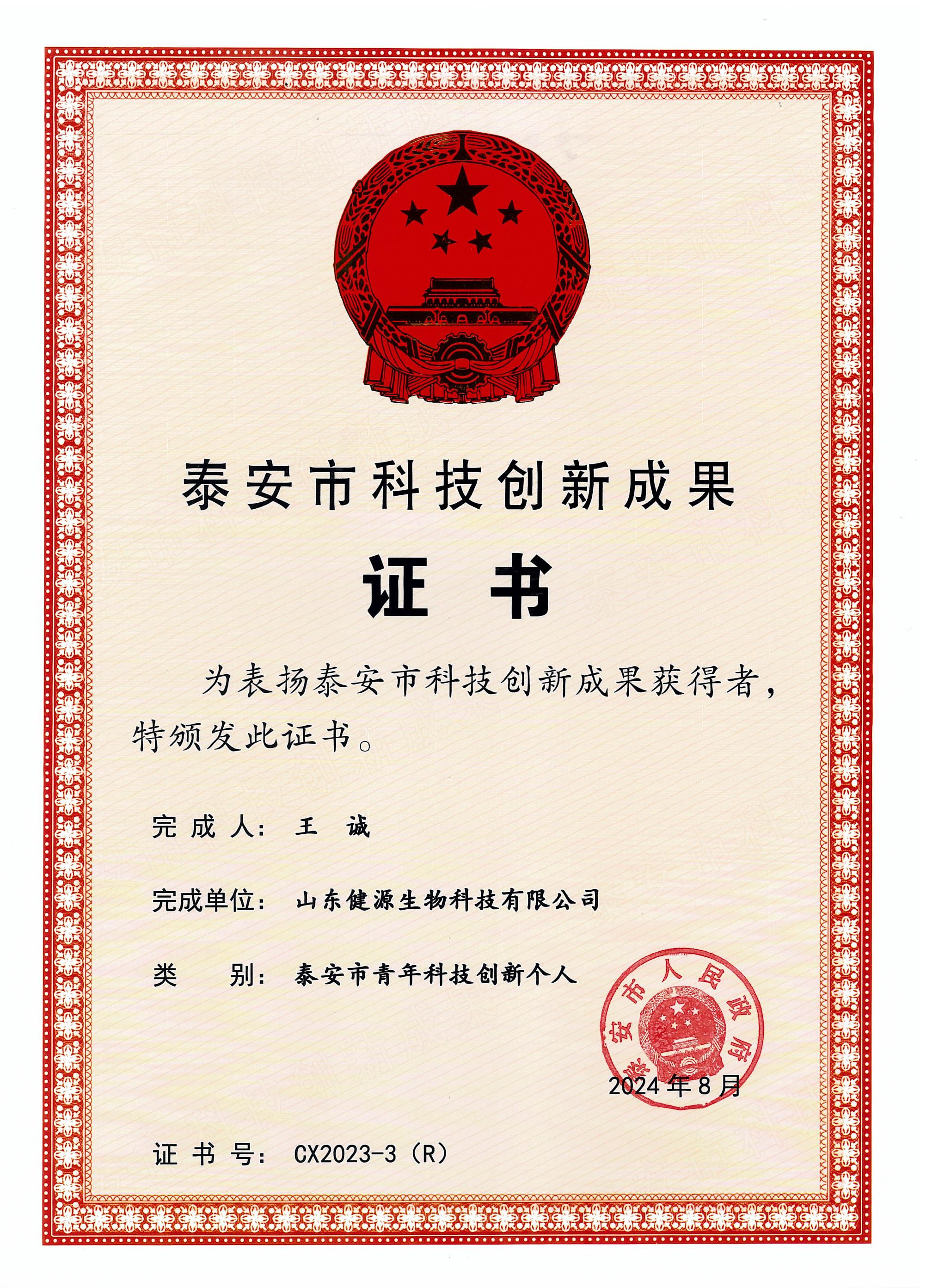 會上宣讀了《泰安市獲2023年度國家、省科學(xué)技術(shù)獎項目名單》和《泰安市人民政府關(guān)于公布2023年度泰安市科技創(chuàng)新成果名單的通知》,為2023年度省科學(xué)技術(shù)獎獲獎代表及市科技創(chuàng)新成果完成人代表頒發(fā)證書。山東健源生物科技有限公司董事長王誠榮獲泰安市青年科技創(chuàng)新個人。