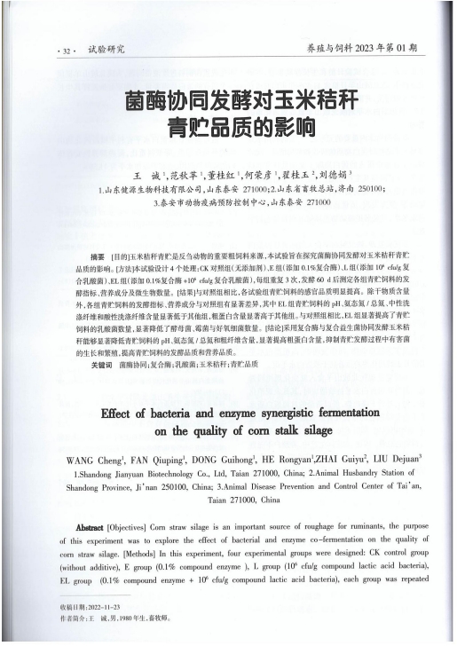發(fā)布時(shí)間:[2025-1-15 17:6:25] 瀏覽量:2590次2024年12月31日,由湖北省科學(xué)技術(shù)協(xié)會(huì)指導(dǎo),湖北省科學(xué)技術(shù)期刊編輯學(xué)會(huì)組織實(shí)施的2023年度湖北省科技期刊百篇優(yōu)秀論文遴選結(jié)果公布,經(jīng)過(guò)評(píng)選,山東健源生物科技有限公司董事長(zhǎng)王誠(chéng)帶領(lǐng)研發(fā)團(tuán)隊(duì)撰寫的《菌酶協(xié)同發(fā)酵對(duì)玉米秸稈青貯品質(zhì)的影響》論文入選2023年度湖北省科技期刊百篇優(yōu)秀論文。