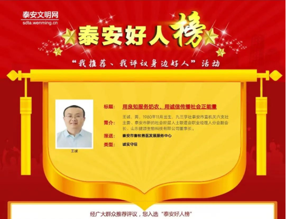 一、王誠(chéng)董事長(zhǎng)光榮入選五月“泰安好人榜”——由泰安市精神文明建設(shè)委員會(huì)頒發(fā) 由泰安文明辦主辦...
