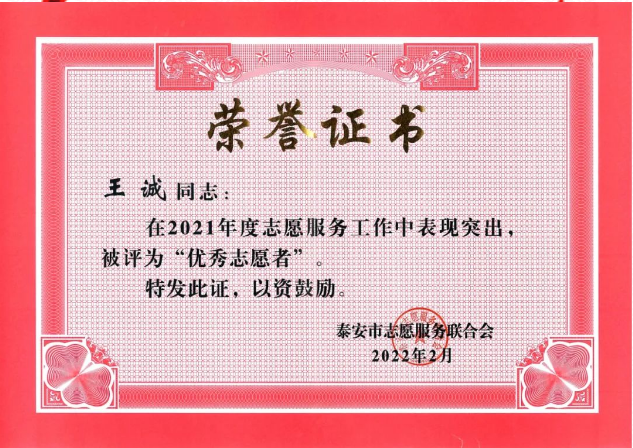 2022-3-4 熱烈祝賀山東健源生物王誠董事長榮獲2021年度“志愿者”榮譽稱號