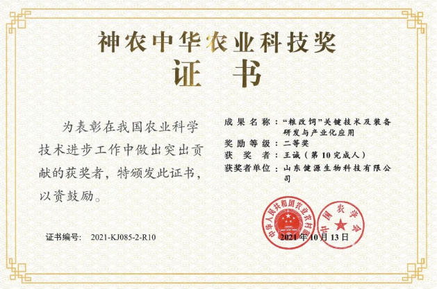2022-3-7 祝賀山東健源生物及王誠董事長榮獲神農(nóng)中華農(nóng)業(yè)科技獎科學(xué)研究類成果“二等獎”