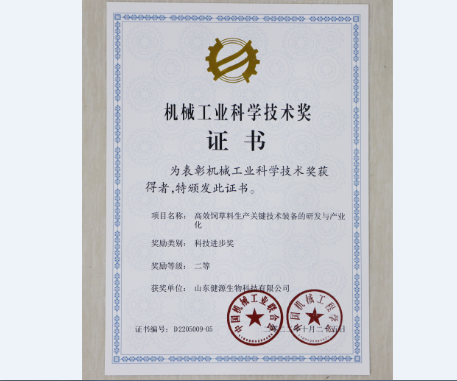 10月20日,中國(guó)機(jī)械工業(yè)聯(lián)合會(huì)、中國(guó)機(jī)械工程學(xué)會(huì)發(fā)布了《關(guān)于表彰2022年度“機(jī)械工業(yè)科學(xué)技術(shù)獎(jiǎng)”獎(jiǎng)勵(lì)項(xiàng)目的通報(bào)》文件,山東健源生物科技有限公司參與完成的《高效飼草料生產(chǎn)關(guān)鍵技術(shù)裝備的研發(fā)與產(chǎn)業(yè)化》項(xiàng)目榮獲2022年度機(jī)械工業(yè)科學(xué)技術(shù)獎(jiǎng)“科技進(jìn)步獎(jiǎng)二等獎(jiǎng)”。
