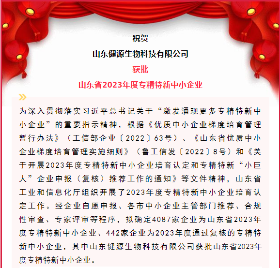 山東健源生物獲批山東省2023年度專精特新中小企業(yè)