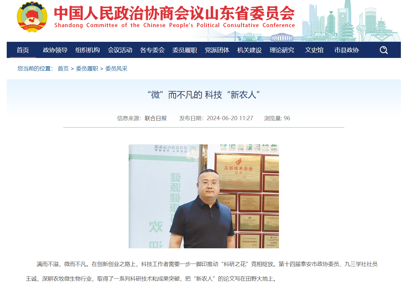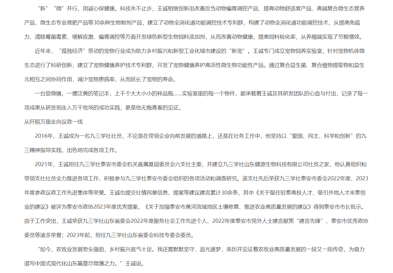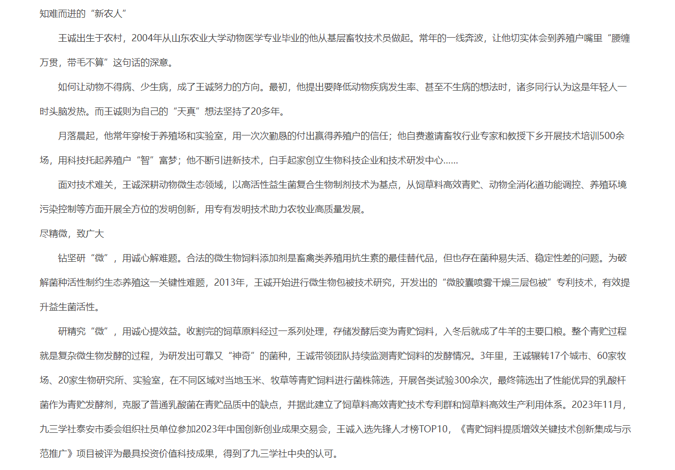 發(fā)布時(shí)間:[2024-8-7 15:16:1] 瀏覽量:3311次近日,中國人民政治協(xié)商會(huì)議山東省委員會(huì)官網(wǎng)推送《“微”而不凡的 科技“新農(nóng)人”》文章,報(bào)道山東健源生物科技有限公司董事長王誠作為“新農(nóng)人”,20多年來深耕微生態(tài)領(lǐng)域,以高活動(dòng)性益生菌復(fù)合生物制劑技術(shù)為基點(diǎn),從飼草料高效青貯、動(dòng)物全消化道功能調(diào)控、養(yǎng)殖環(huán)境污染控制等方面全方位的發(fā)明創(chuàng)新,用專有發(fā)明技術(shù)助力農(nóng)牧業(yè)高質(zhì)量發(fā)展。而作為一名九三學(xué)社社員,王誠董事長堅(jiān)持以“愛國、民主、科學(xué)和創(chuàng)新”的九三精神指導(dǎo)實(shí)踐,出色地完成各項(xiàng)工作。全文如下: